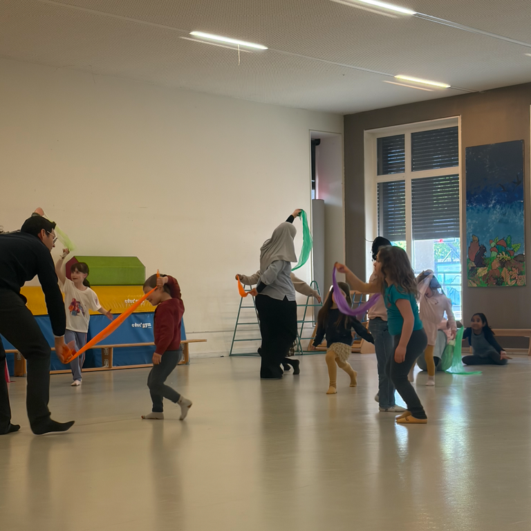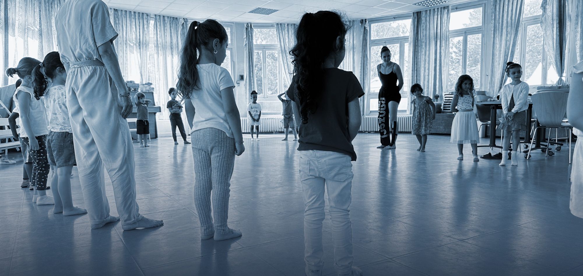 Nous faisons aussi du lien avec l'univers de l'enfant en s'appuyant sur des comptines, des histoires connus afin d'engager le mouvement. Ainsi, les enfants sont initiés à un nouveau mode d'expression. Ces ateliers renforcent le groupe, l'épanouissement, les relations entre les éducatrices.eurs, l'imaginaire et la connaissance de soi grâce à une expérience collective.