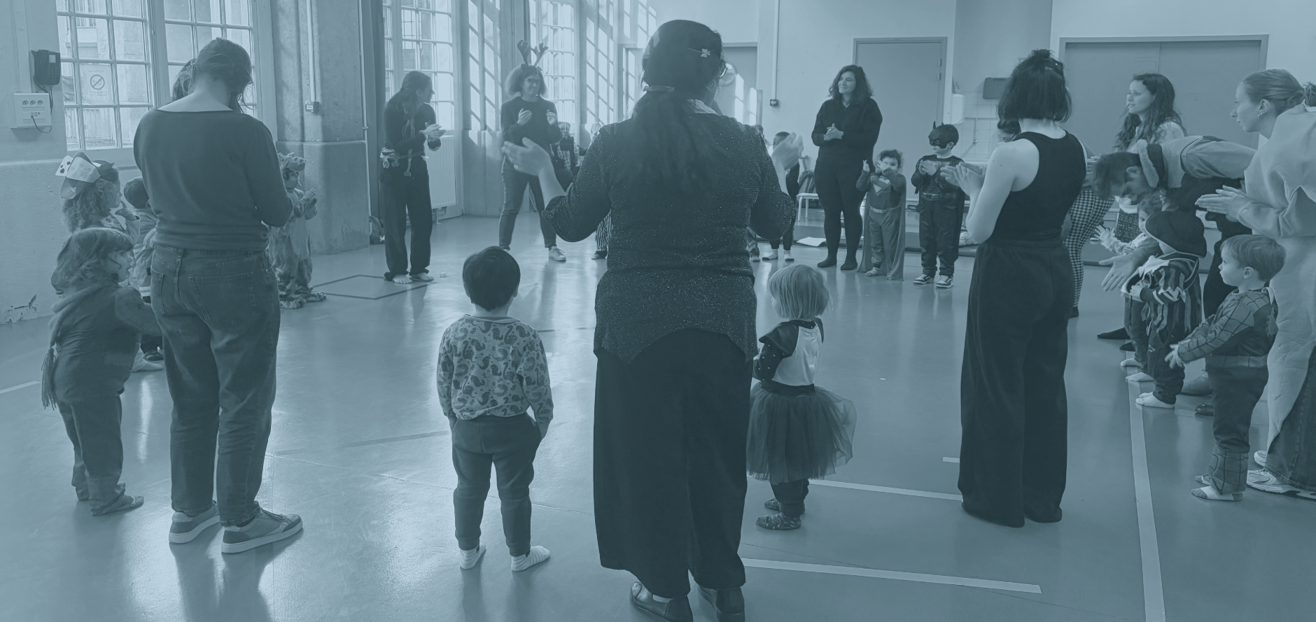 À la fin de chaque module, nous proposons une médiation. improvisée nommée Couper/Coller en invitant les enfants, les parents et les professionnel(le)s de la petite enfance dans la danse.