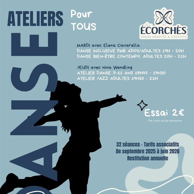 L’association Les Écorchés vous invite à découvrir ses cours de danse ouverts à tous à Lyon 7. Dans une ambiance conviviale et bienveillante, chaque séance mêle technique, créativité et plaisir du mouvement. Les ateliers sont accessibles à tous les âges et niveaux, tous les publics, favorisant l’expression corporelle et la confiance en soi. Encadrés par des professionnels passionnés, les ateliers encouragent l’échange, la découverte et le dépassement personnel. Idéal pour s'épanouir, rencontrer du monde et se reconnecter à son corps. Les sessions hebdomadaires se déroulent à l'école Ravier. L’inscription est ouverte dès maintenant pour la saison 2025/2026. Rejoignez Les Écorchés et dansez la vie à Lyon 7 !